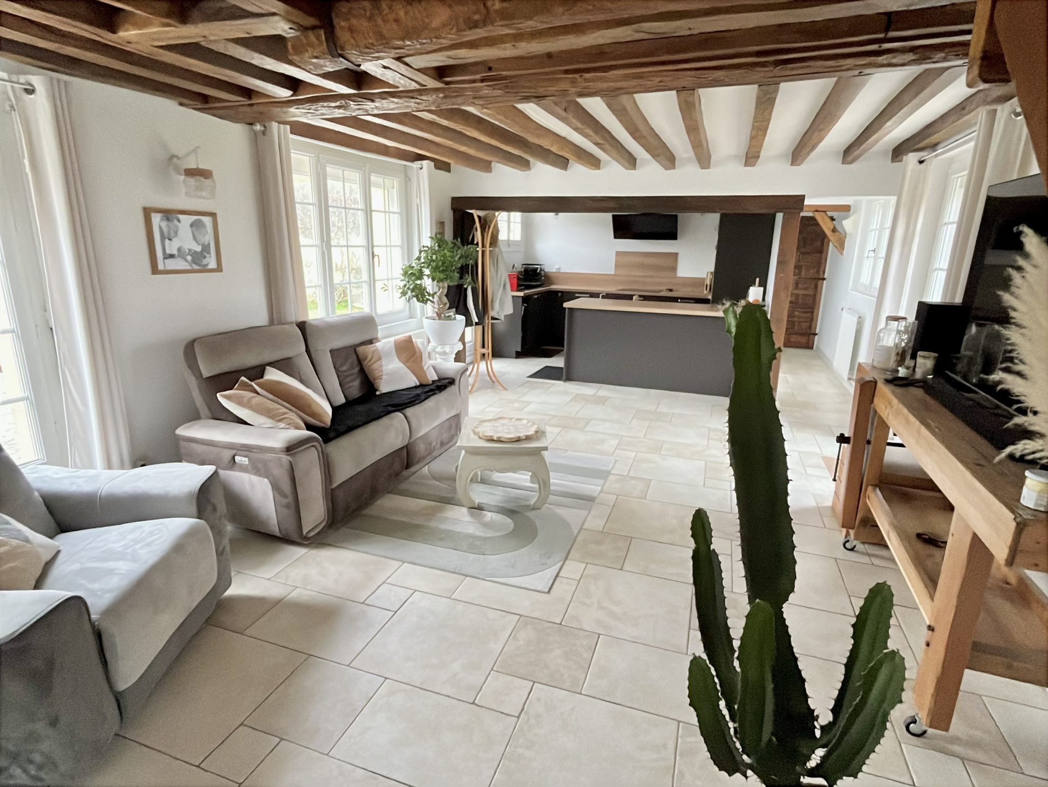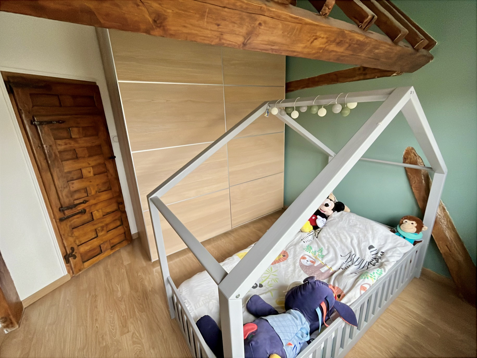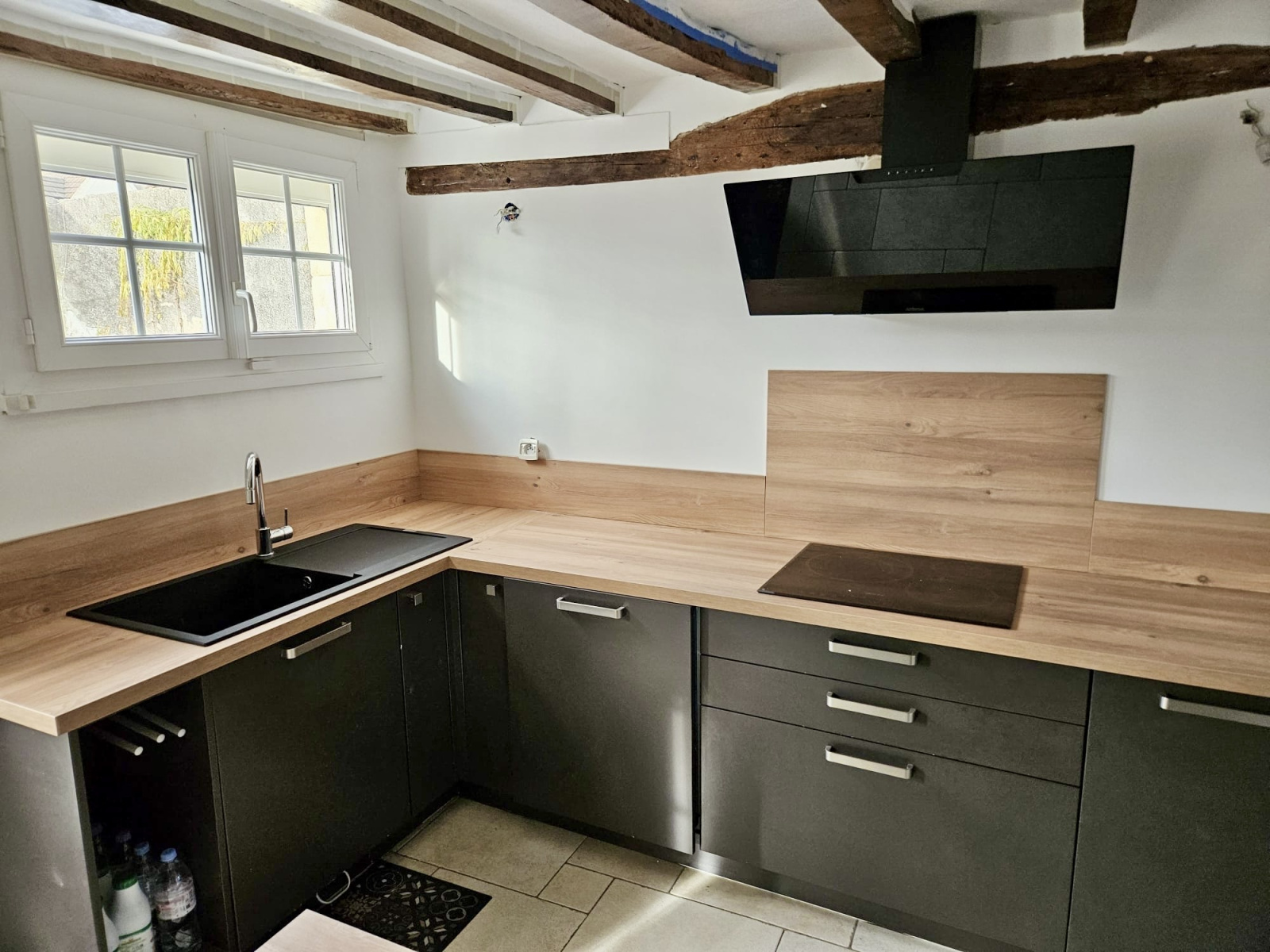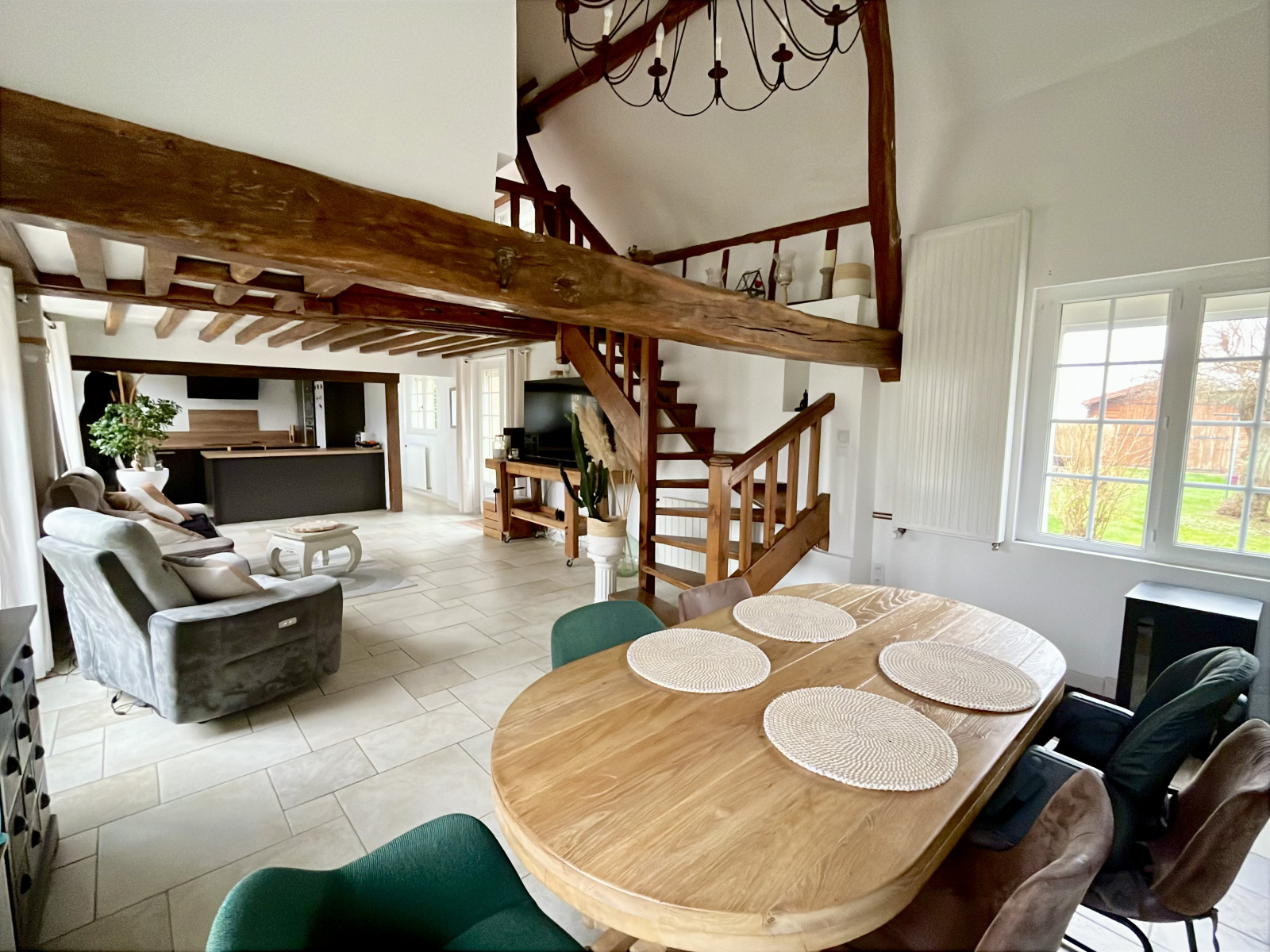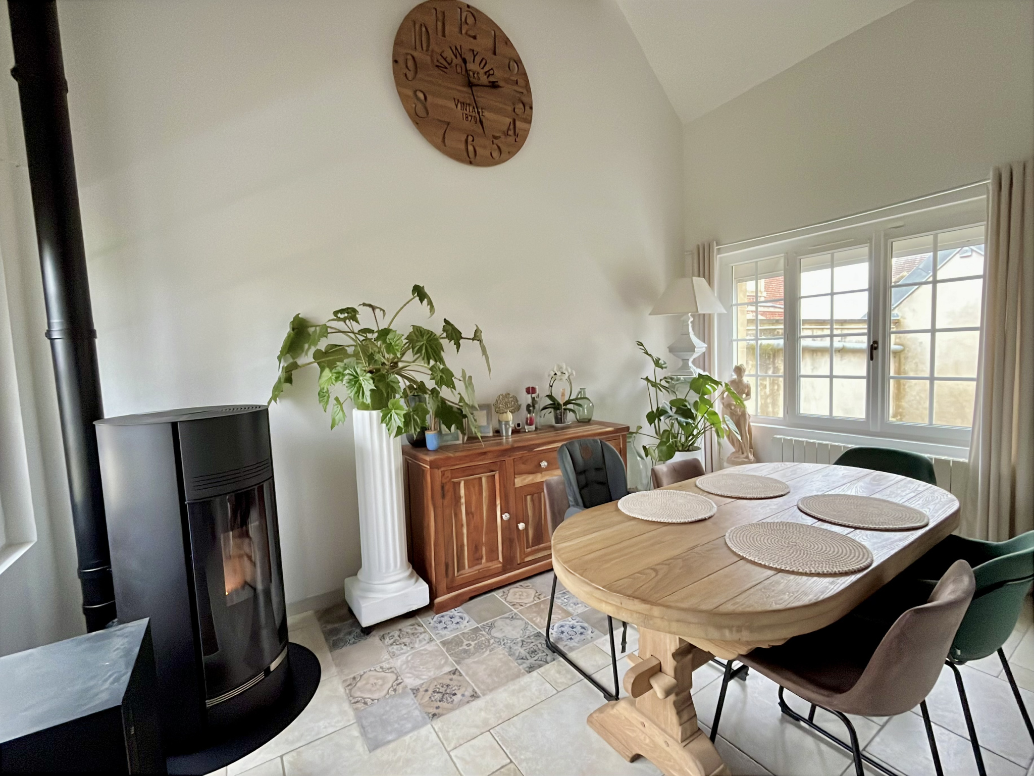 - au rez-de-chaussée : séjour double avec poêle à granulés, une cuisine ouverte entièrement aménagée et équipée, dégagement, salle de bains, WC, chaufferie.