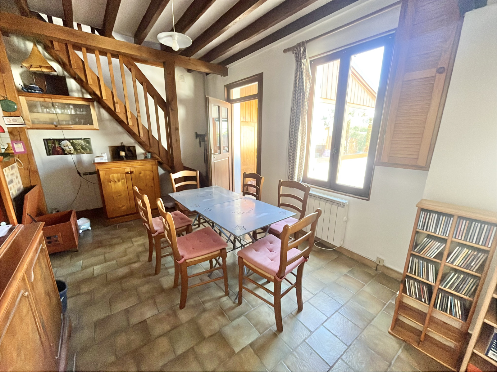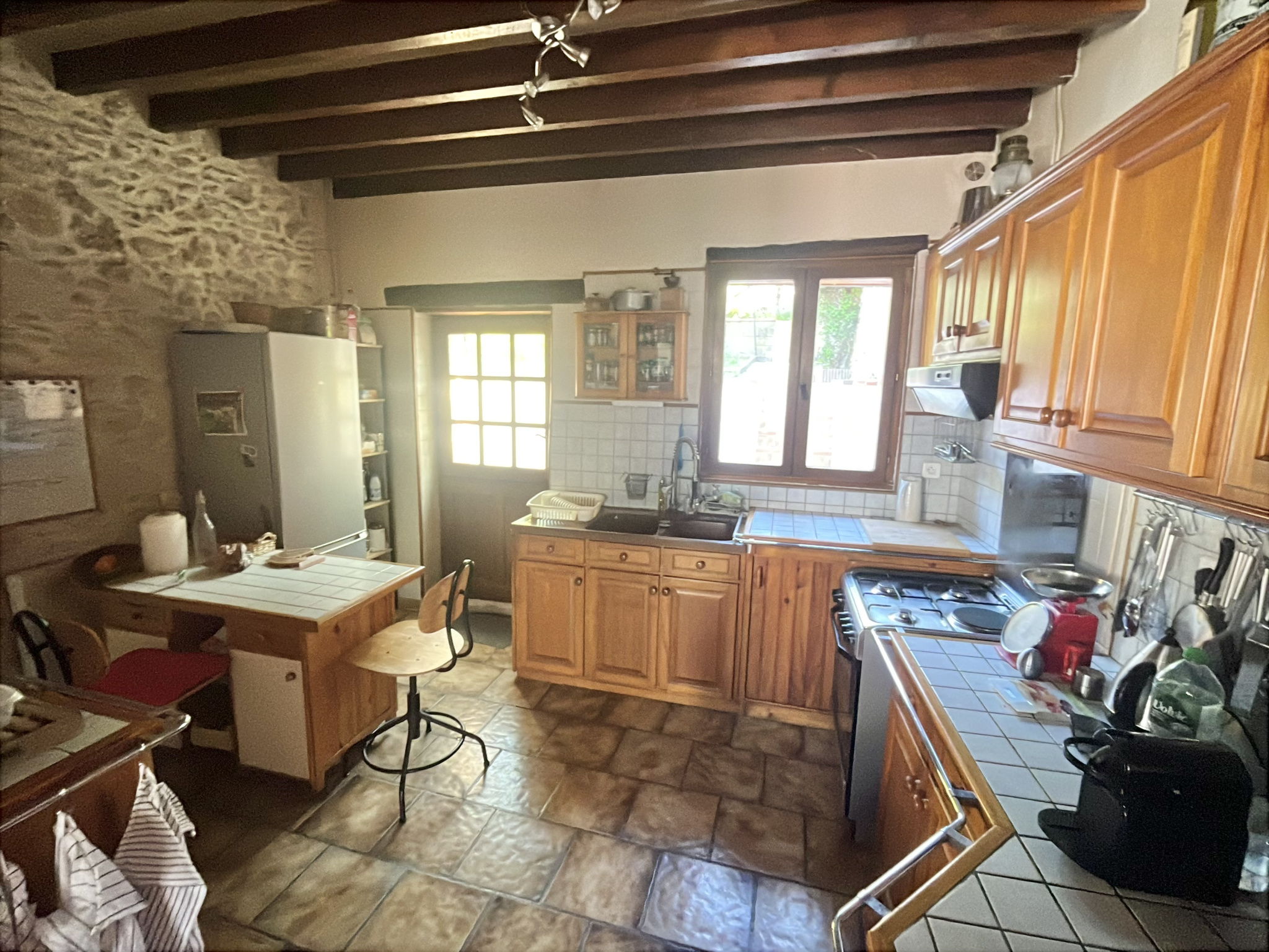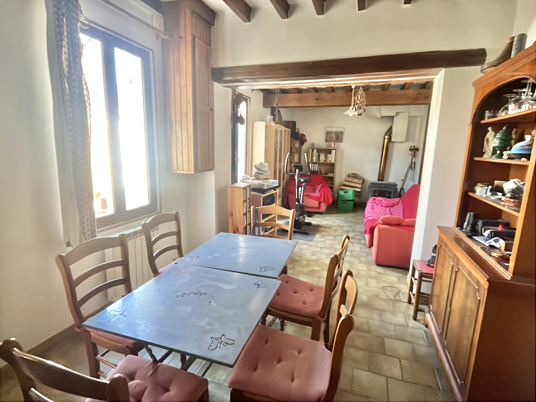- au rez-de-chaussée : une entrée, un séjour avec poêle à bois, une cuisine aménagée, un bureau ou petite chambre, dégagement, un WC, une salle d'eau.