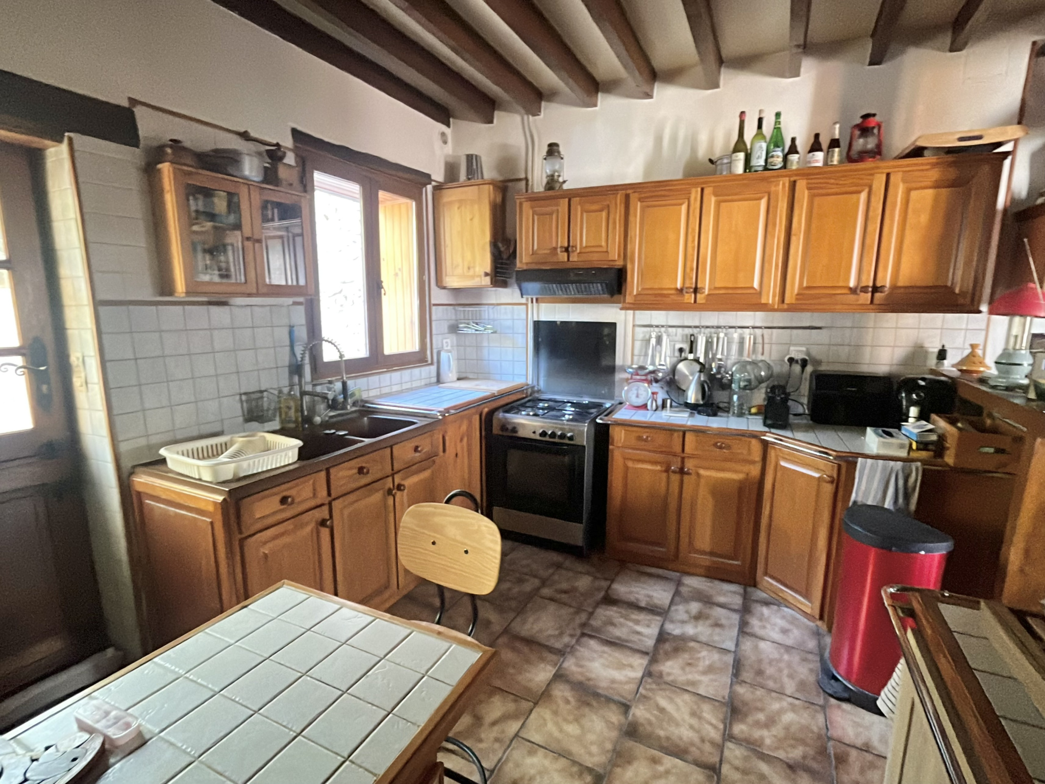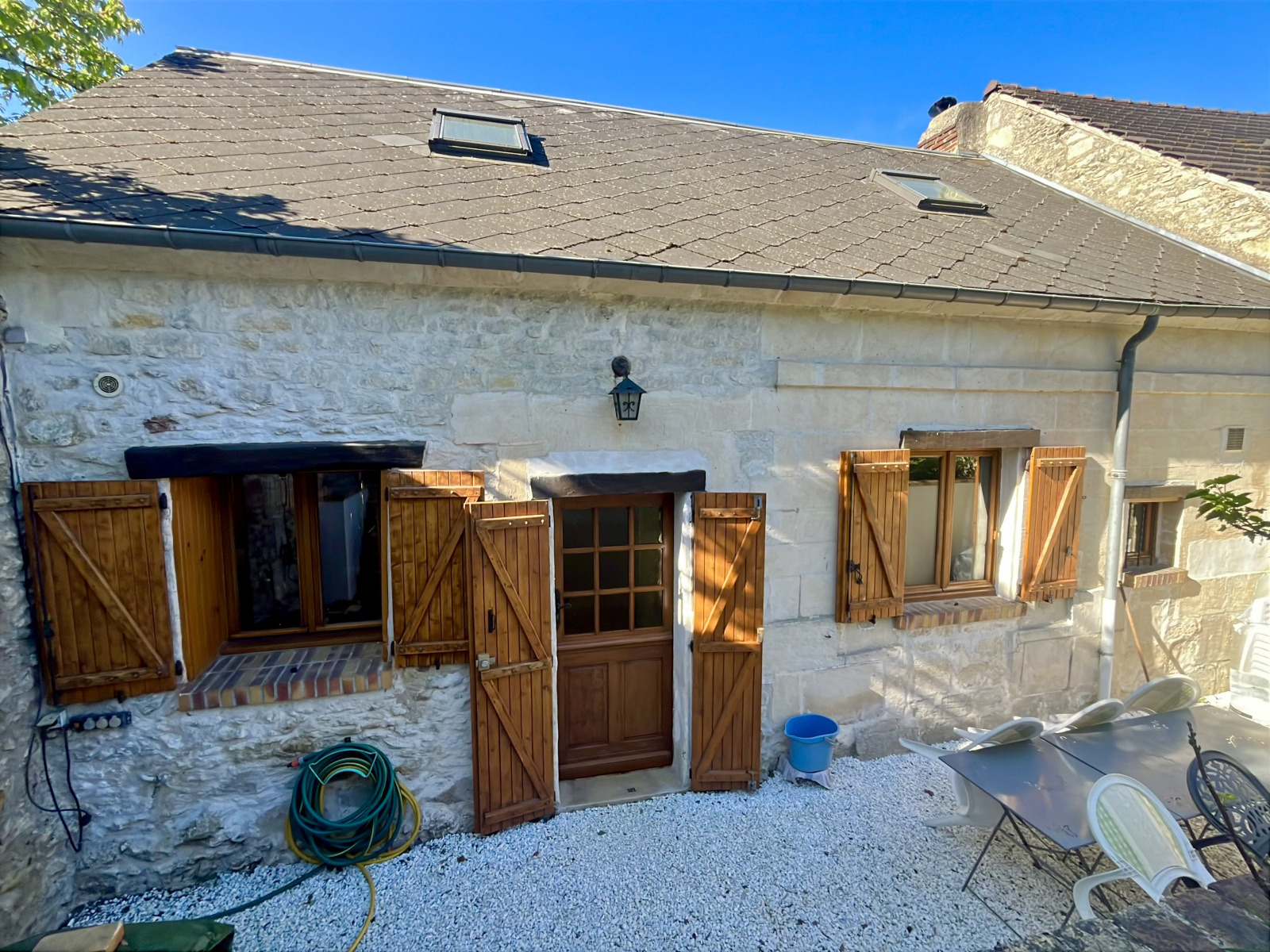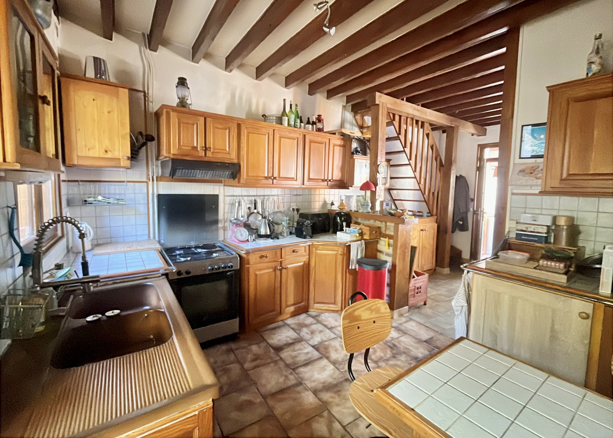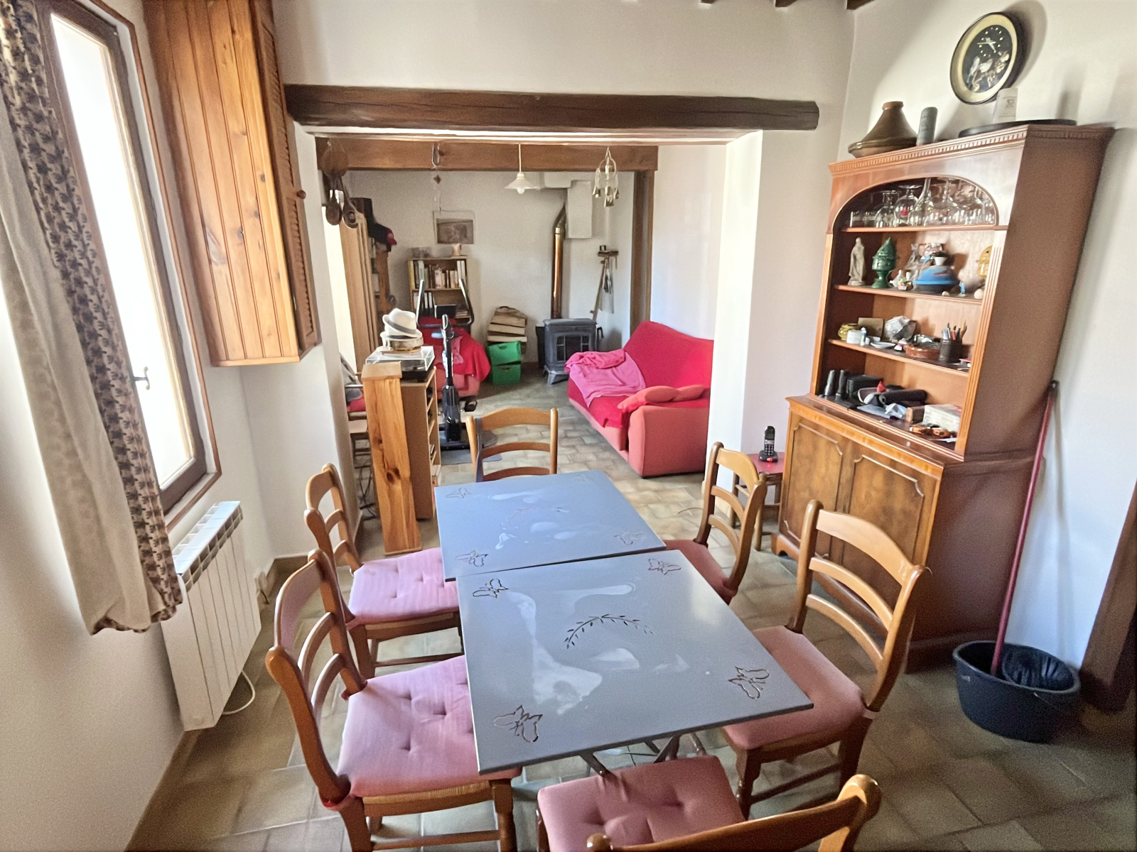 - au rez-de-chaussée : une entrée, un séjour avec poêle à bois, une cuisine aménagée, un bureau ou petite chambre, dégagement, un WC, une salle d'eau.