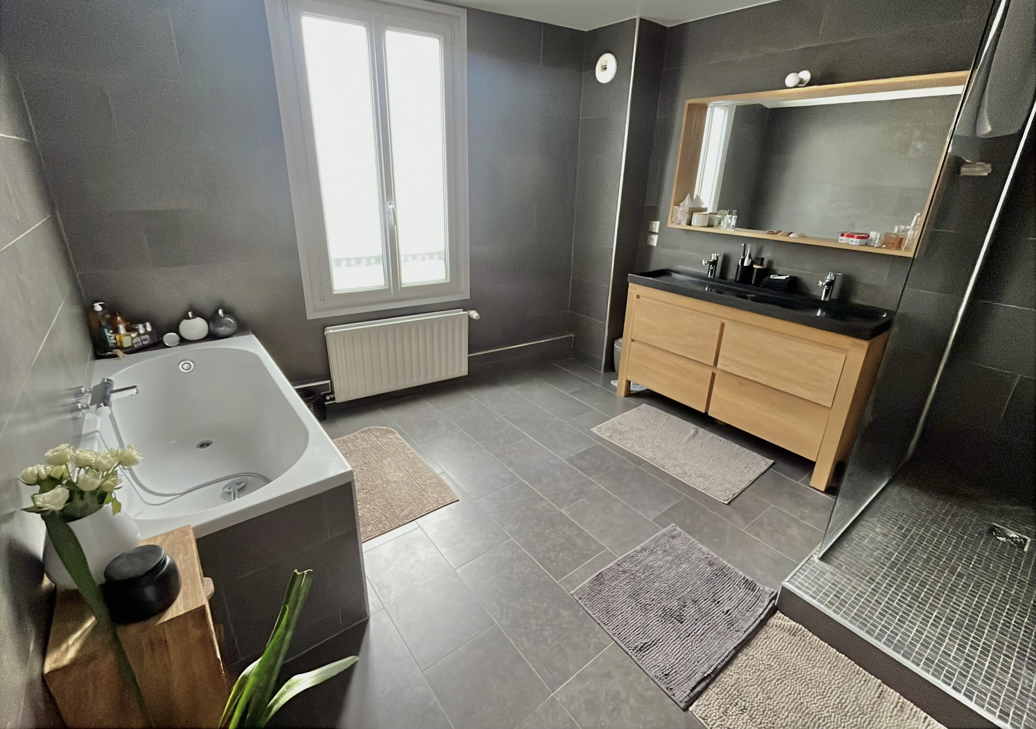- au 1er étage : couloir desservant un espace dressing/bureau, 2 chambres, une grande salle de bains avec baignoire et douche, un WC/buanderie.