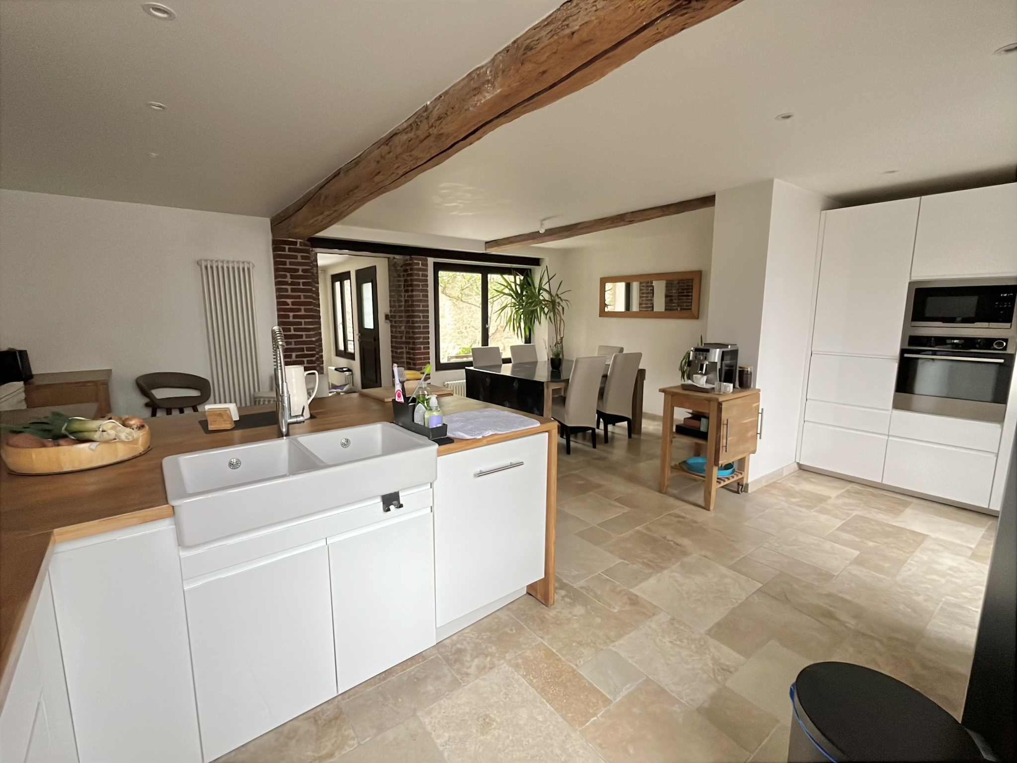 - au rez-de-chaussée : une entrée, un séjour avec cuisine ouverte entièrement aménagée et équipée, un salon avec poêle à bois, un dégagement et un WC.